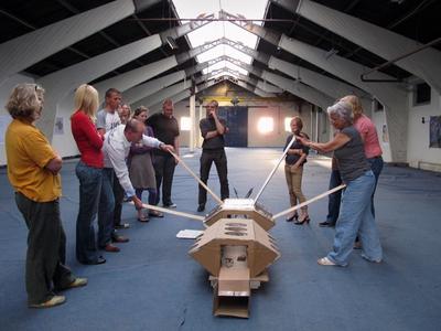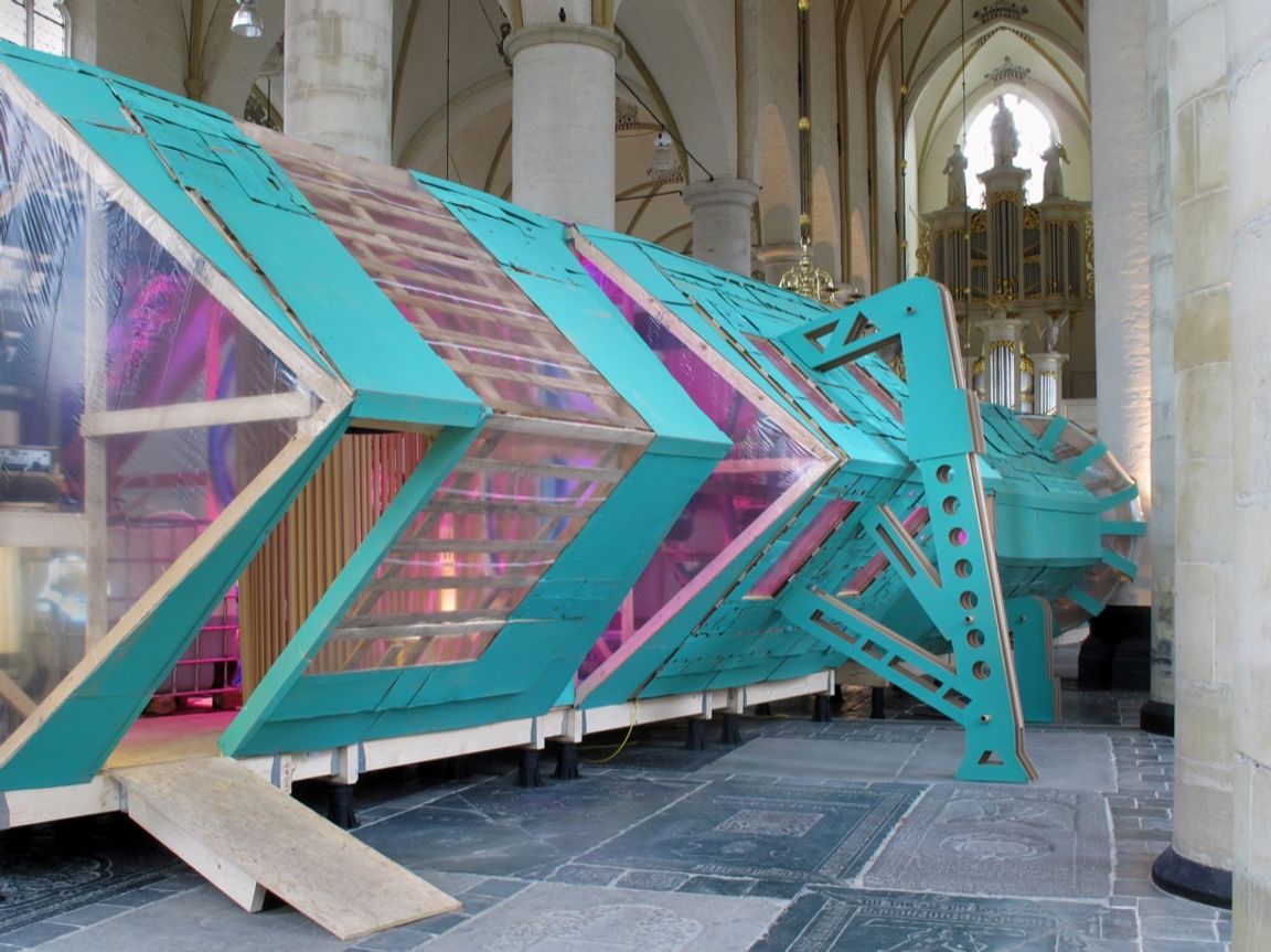 The first version of Seeker was developed in Deventer in the context of the Witteveen+Bos Art+Technology Award that Angelo Vermeulen received in 2012. A mixed community of engineers and artists worked for several months on a 22-metre long spaceship sculpture that integrated audiovisuals, sustainable energy production, and biological life support was exhibit at the Bergkerk Church in Deventer.