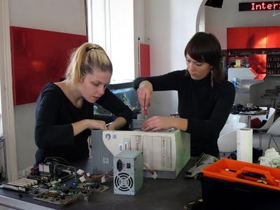 The Biomodd [MRBw] workshop led by Diego Maranan and Angelo Vermeulen and was part of the KIBLIX Festival and the International Computer Arts Festival in Maribor, Slovenia, 2010. This Biomodd version, that visually resembles an impressive tower, consisted out of computers cases that were stacked in a spiral. The components were mounted on the exterior, turning the interior into the exterior. Within the tower there were seven computers up and running that had a game installed on all of them. Just like previous Biomodd’s an algae-cooled motherboard was an important part. However unlike previous mods, the cooling tubes were suspended above the ground and extended for several meters, encroaching into a gallery space just next to the workshop space. The system for watering plants was built at the top of the tower using syringes and IV drips. An extra component that was featured in this Biomodd was a satellite installation near a window that was composed of two computers, two webcams, a monitor, and a TV. One webcam captured video of the workshop space and sent it to the monitor, which was on the window and was facing the street, so spectators could watch the Biomodd being built live. The other webcam scanned the window ledge in a sweeping motion, monitoring the plants and the computer components on the ledge, and sent the video to the TV, which was facing the workshop space. We also fed the sound of the aerating algae into the TV, giving Biomodd for the first time a sound. The workshop resulted in an installation piece that was exhibited at KIBLA.
